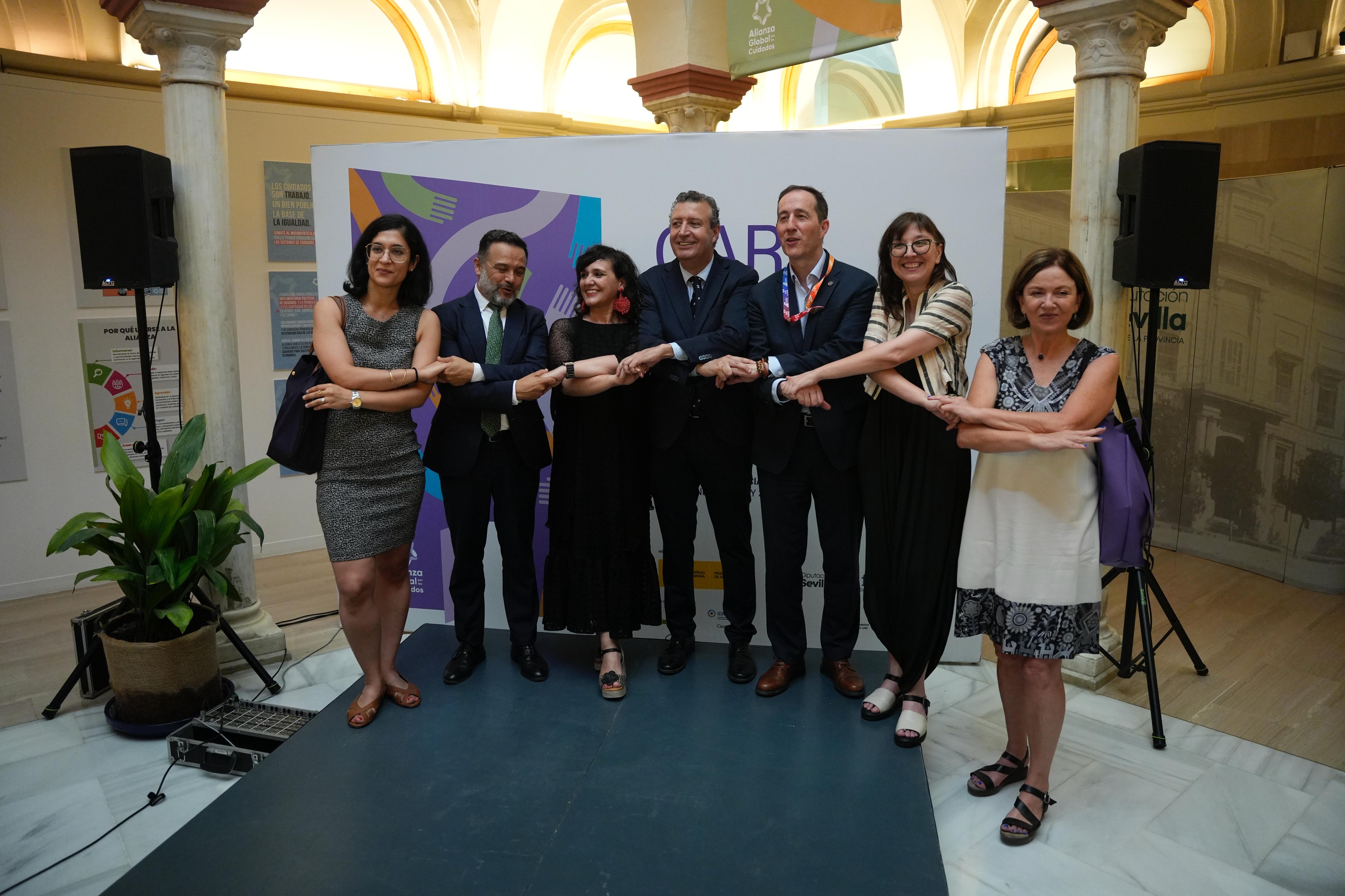 El presidente de la Diputación de Sevilla, Javier Fernández; la secretaria de Estado de Igualdad y para la Erradicación de la Violencia contra las Mujeres, María Guijarro, y la secretaria técnica de Alianza Global por los Cuidados, Ana Moreno, han inaugurado esta tarde el Pabellón de los Cuidados, que estará ubicado en la Casa de la Provincia hasta el 3 de julio, durante un acto al que se han sumado el diputado provincial y vicepresidente de FAMSI, Francisco Toajas, y el vicepresidente de Programas, Centro Internacional de Investigaciones para el Desarrollo de Canadá, Santiago Alba.