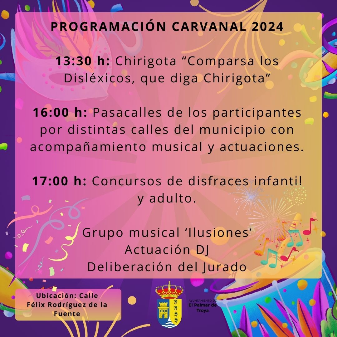 �� El Ayuntamiento de El Palmar de Troya, a través de la Delegación de Festejos y de Cultura, ha puesto en marcha el concurso de disfraces con motivo de la celebración del próximo carnaval, que tendrá lugar el día 24 de febrero de 2024 a las 16:00 horas en la calle Félix Rodríguez de la Fuente. ���� La programación para el Carnaval 2024 será la siguiente: ��13:30 h: Chirigota “Comparsa los Disléxicos, que diga Chirigota”. ��16:00 h: Pasacalles de los participantes por distintas calles del municipio con acompañamiento musical y actuaciones. ������ 17:00 h: Concursos de disfraces infantil y adulto. �� Grupo musical ‘Ilusiones‘. �� Actuación DJ. ����⚖️Deliberación del Jurado �������� Os esperamos a todos para celebrar nuestro Carnava
