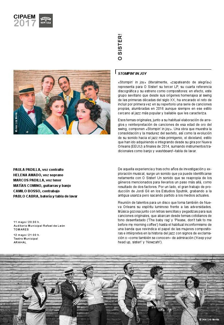 Descargar pdf jueves, 11 de mayo de 2017 / Tomares / Cultura y Juventud CIPAEM 2017. O SISTER! Stompin´in joy. TOMARES MÚSICA Descargar pdf CARTEL O SISTER! Información del evento Lugar: Auditorio Municipal Rafael de León a las 20:30h Contacto: Tel./fax: Información y Venta de Entradas: Delegación de Cultura del Ayto. de Tomares: 954.159.210 Inicio: 11 de mayo de 2017 PROGRAMA CIPAEM 2017 TOMARES TOMARES-CIPAEM-2017-WEB 138.03 kb Formato: pdf
