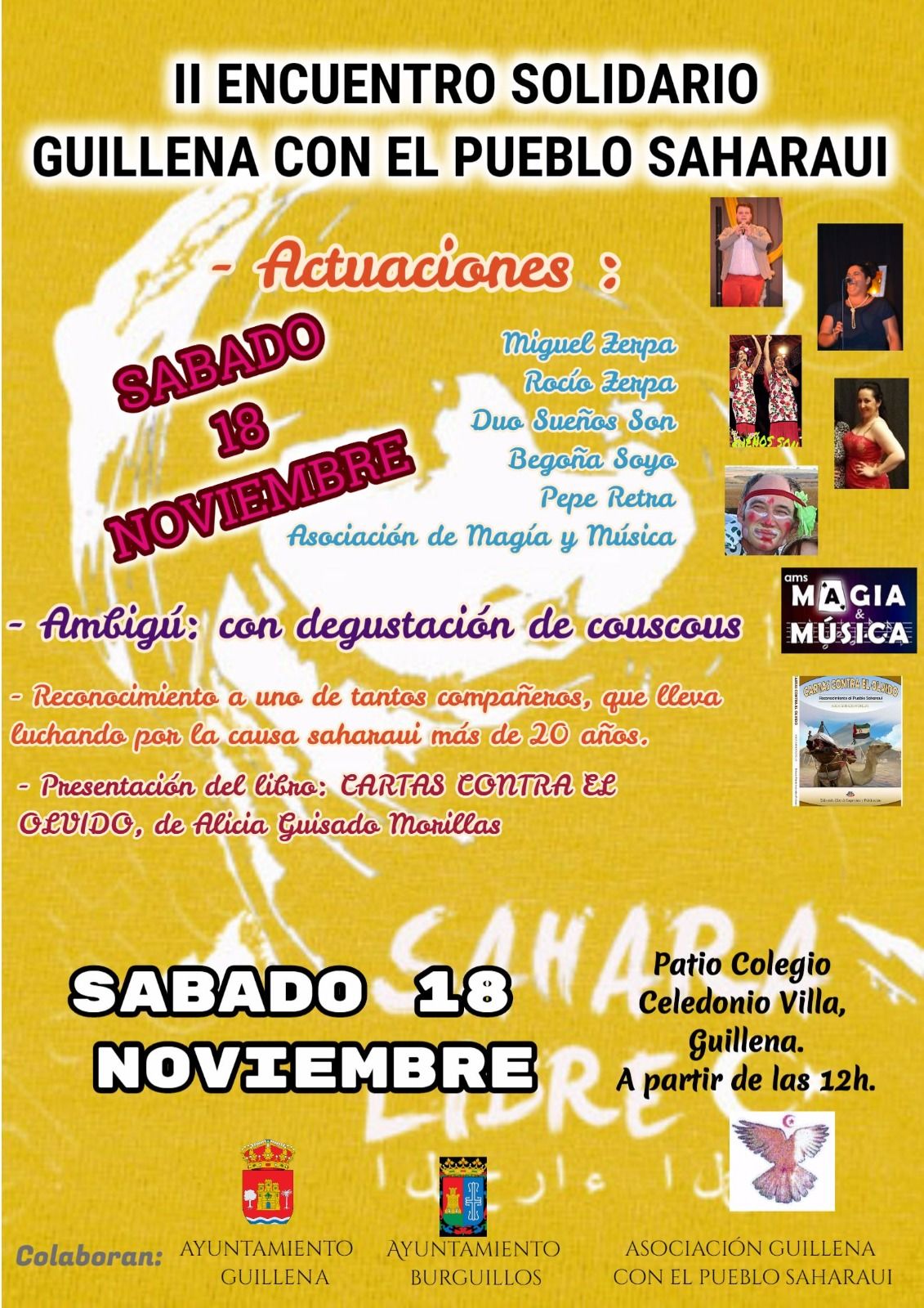 El sábado 18 de noviembre, en el patio del colegio Celedonio Villa, se va a celebrar el II Encuentro Solidario Guillena con el Pueblo Saharaui. A partir de las 12 de la mañana, tendrá lugar este evento solidario, organizado por la Asociación Guillena con el Pueblo Saharaui, que tiene como objetivo recaudar fondos para el programa ‘Vacaciones en Paz’, que permite que niños saharauis pasen el verano en Guillena.