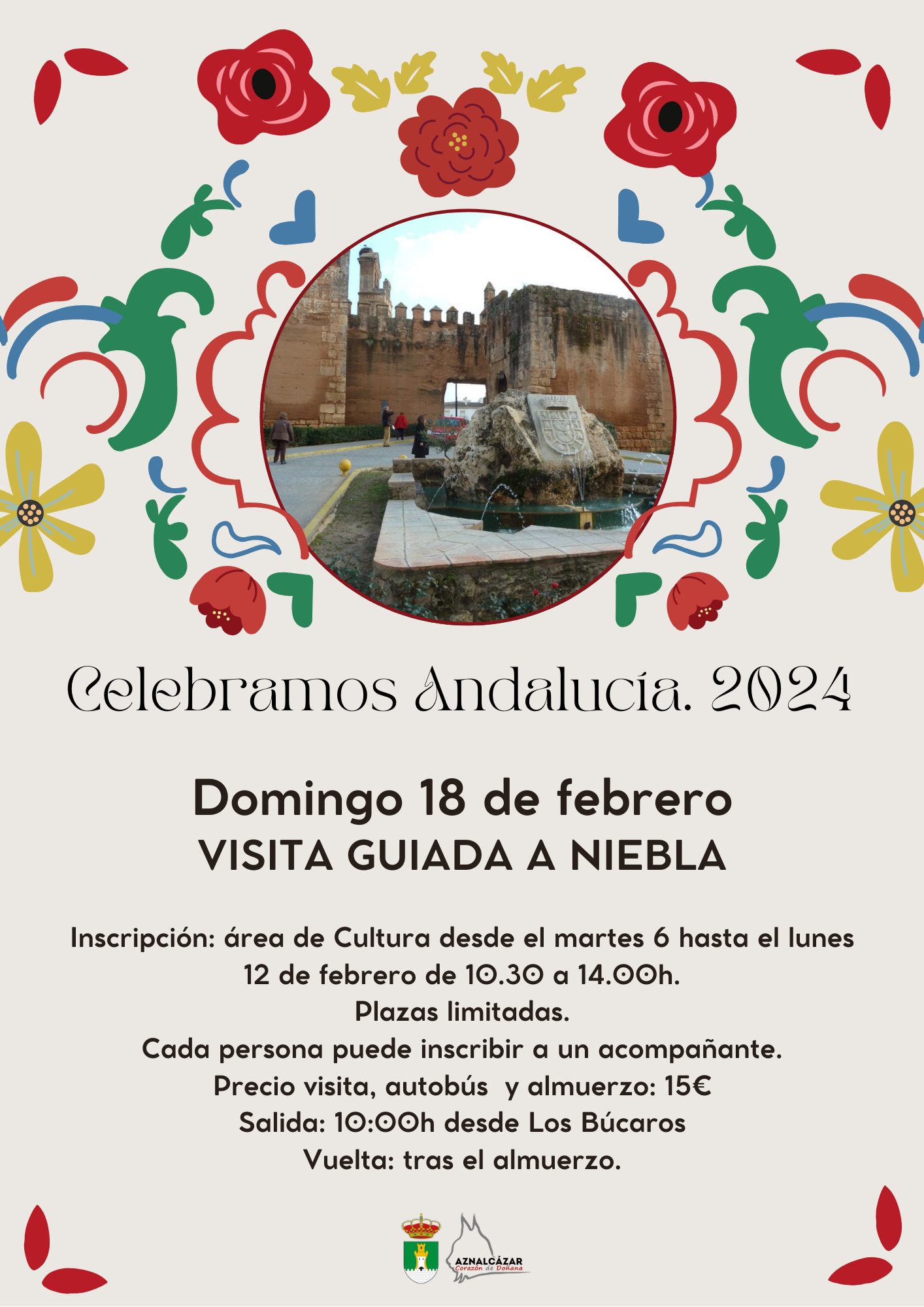 CELEBRAMOS ANDALUCÍA 2024Una de las actividades programada en torno a la celebración del Día de Andalucía es la visita al municipio de Niebla (Huelva), un destacado enclave en los albores de la historia, asentamiento de diferentes pueblos como fenicios, romanos, visigodos y musulmanes.Inscripción: área de Cultura desde el martes 6 hasta el lunes 12 de febrero de 10.30 a 14.00h.Plazas limitadas.Cada persona puede inscribir a un acompañante.Precio visita, autobús y almuerzo: 15€Salida: 10:00h desde Los BúcarosVuelta: tras el almuerzo.