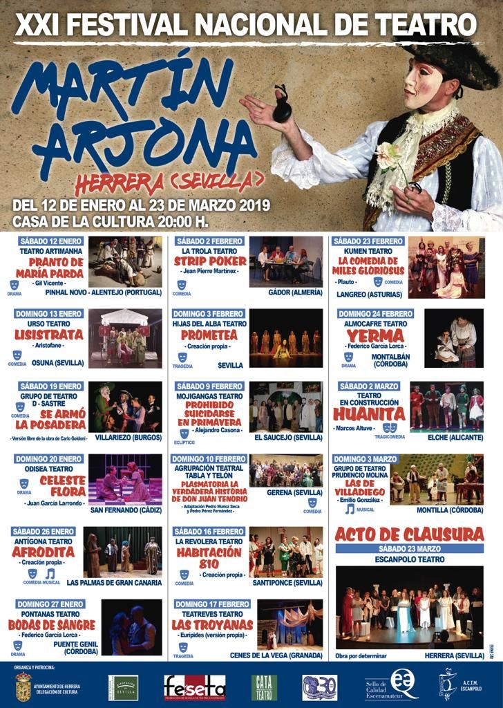 Descargar pdf Del 15 de enero al 23 de marzo de 2019 / Herrera / Cultura y Juventud XXI Festival Nacional de Teatro "Martín Arjona". Herrera Descargar pdf Información del evento Lugar: Casa de la Cultura a las 20 horas Inicio: 15 de enero de 2019 Finalización: 23 de marzo de 2019 PROGRAMA FESTIVAL DE TEATRO 2019 NOTICIA FESTIVAL DE TEATRO 2019 PROGRAMA 84.8 kb Formato: pdf