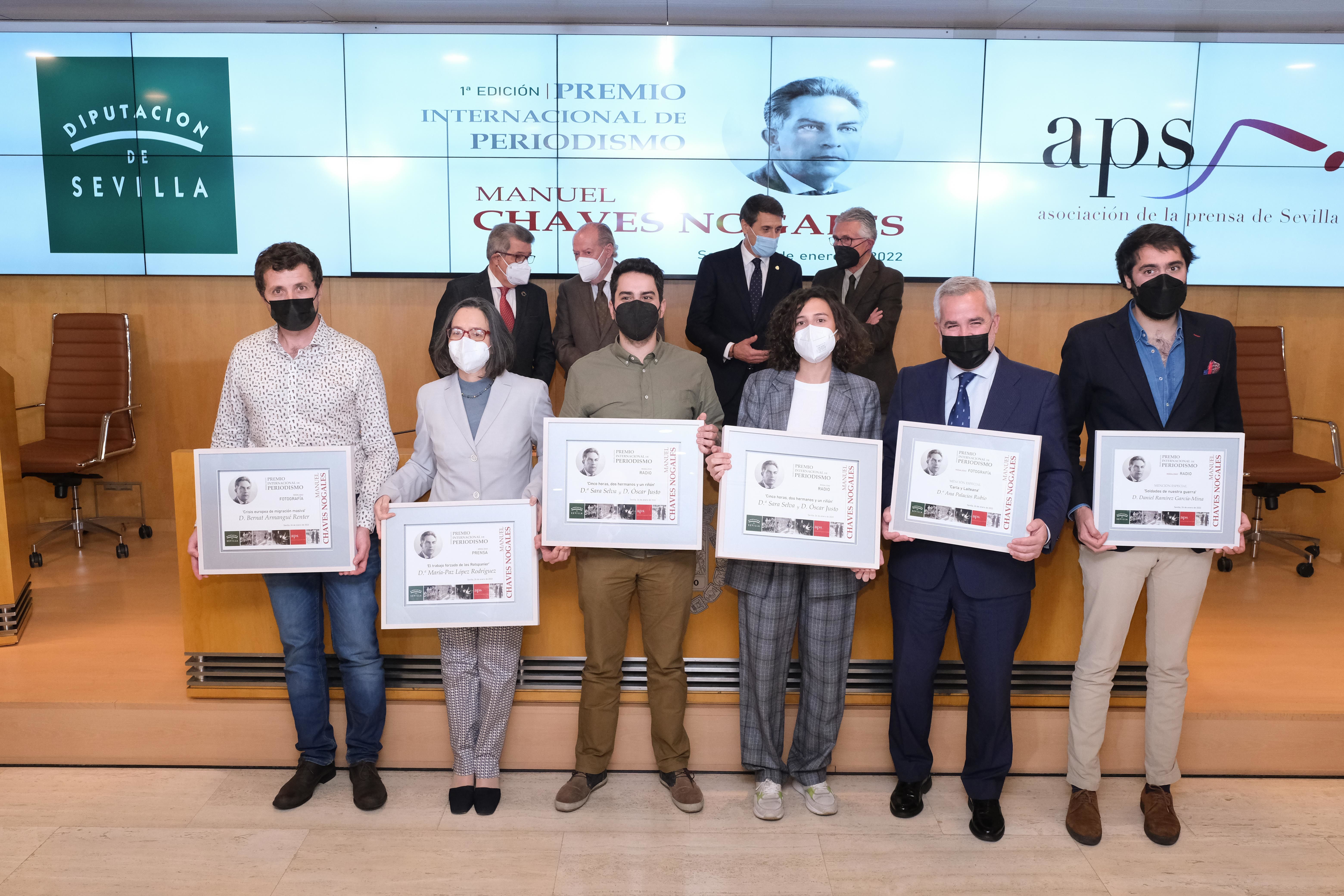 Además, compondrán el jurado: — El Presidente de la Asociación de la Prensa de Sevilla (APS) o en quien delegue. — Un miembro del Gabinete de Comunicación de la Diputación Provincial de Sevilla. — Un miembro de la familia de Manuel Chaves Nogales. — Cinco profesionales del periodismo de amplia trayectoria en los distintos ámbitos que se reconocen: prensa, radio, televisión y fotografía.