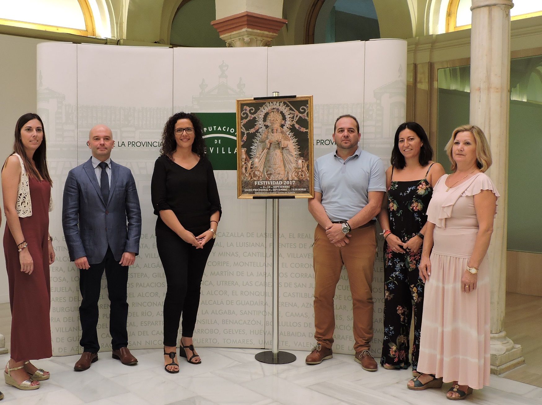 La localidad sevillana de Albaida del Aljarafe 'se vestirá' de blanco y morado, los colores de la Hermandad de la Soledad, del 4 al 10 de septiembre, para celebrar las Fiestas en honor a la Virgen de los Dolores en su Soledad, evento cuyo cartel y programación se han presentado hoy, en la Casa de la Provincia de la Diputación, con la diputada provincial de Cultura y Ciudadanía, Rocío Sutil y el delegado provincial de Cultura de la Junta de Andalucía, José Manuel Girela, acompañando al alcalde albaidejo, José Antonio Gelo, y a los responsables de la Hermandad de la Soledad.