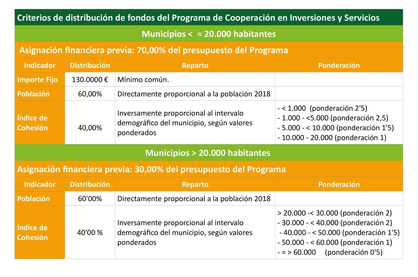 Dentro de las asignaciones a los pueblos menores, se asigna un fijo inicial de 130.000 € y, después, otro 60% de la cuantía de cada localidad se concede directamente proporcional al número de habitantes. Finalmente, el 40% restante se otorga ponderando la población en horquillas menores.