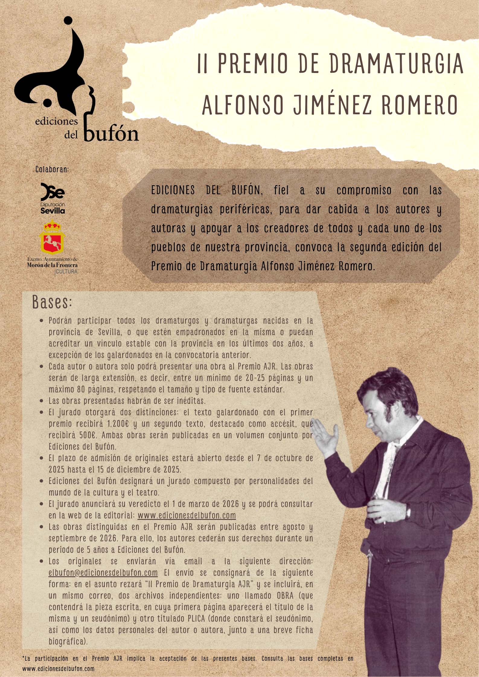 Editorial “de pueblo”, radicada en Morón de la Frontera, Ediciones del Bufón tiene un compromiso profundo con la dramaturgia periférica, poniendo especial énfasis en la creación de las áreas rurales, razón por la que convoca este Premio, con el nombre de uno de los grandes escritores españoles de teatro, el moronense Alfonso Jiménez Romero, cuyo vínculo con los pueblos fue fundamental para su escritura.