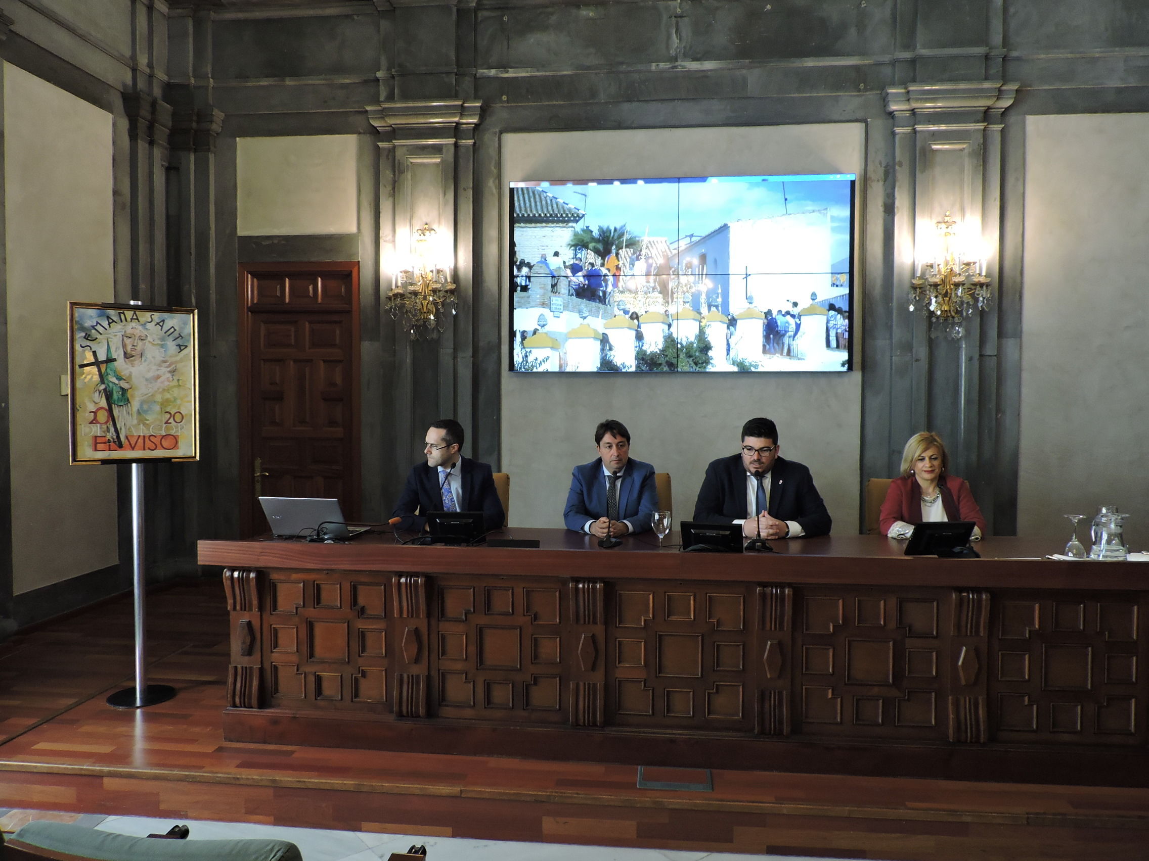 El alcalde visueño, Gabriel Santos, presentaba en la capital hispalense la imagen que es ya pórtico y anuncio de la llegada de la Semana Mayor de El Viso y escogía para tal fin la Casa de la Provincia de la Diputación, en un acto en el que estaba acompañado por los delegados municipales de Festejos, María de Gracia Miranda; de Participación, Manuel Salvat, y de Desarrollo, Beatriz Roldán.