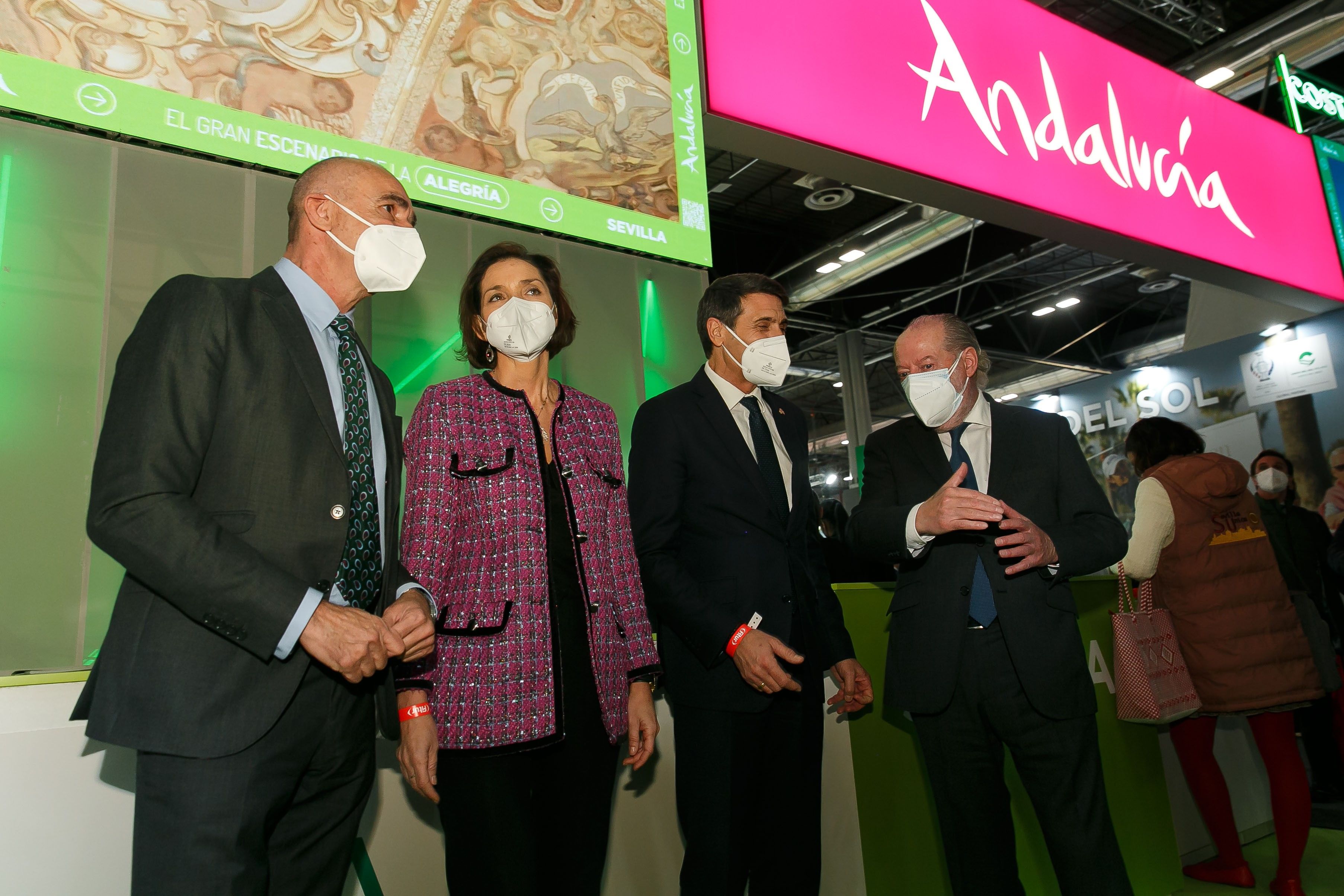 El presidente de la Diputación, Fernando Rodríguez Villalobos, y el alcalde de Sevilla, Antonio Muñoz, acompañados por los representantes del sector turístico sevillano y alcaldes y concejales de la provincia, han recibido en el stand de la provincia de Sevilla a la ministra de Industria, Comercio y Turismo del Gobierno de España, Reyes Maroto, que ha recorrido el pabellón de Andalucía en FITUR.