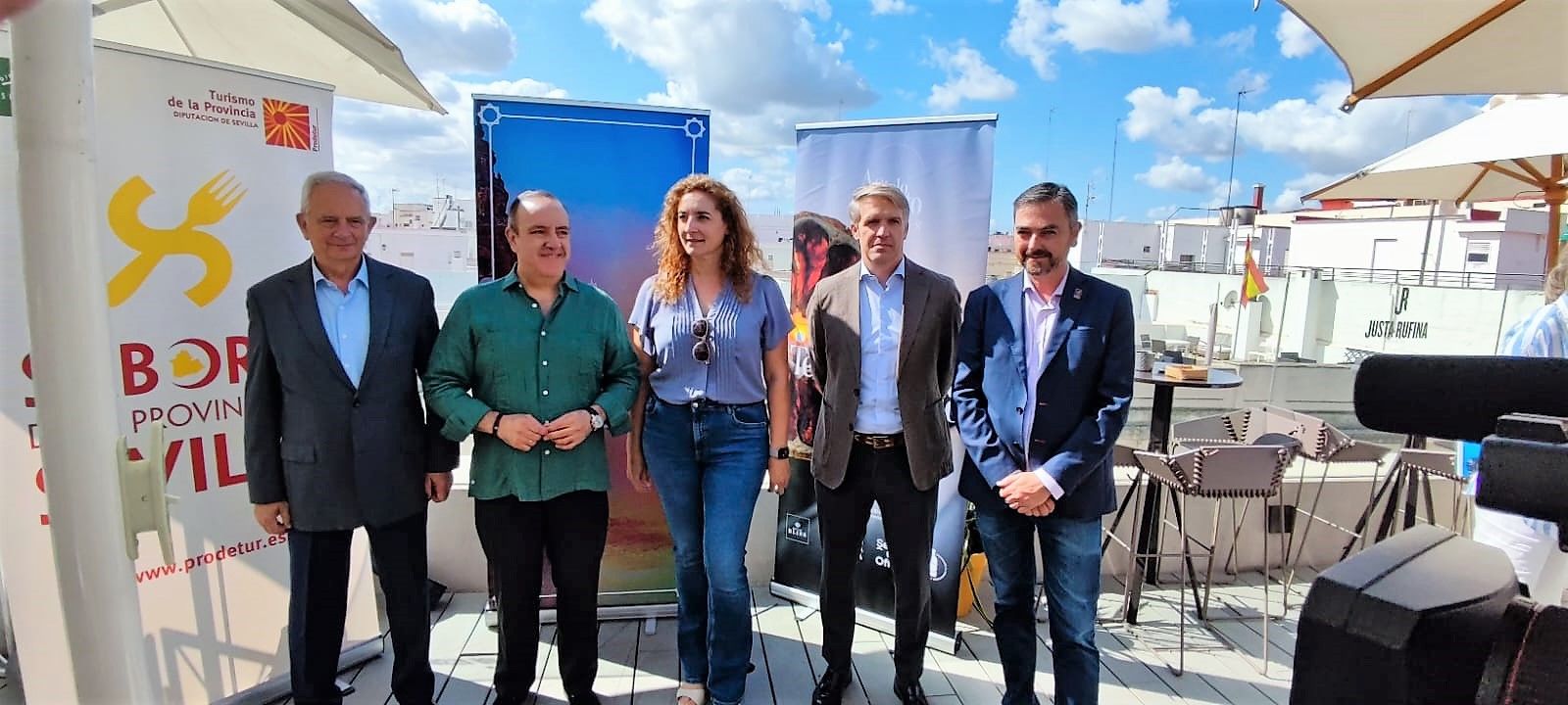 Manuela Cabello, vicepresidenta de Prodetur, junto a Manuel Cornax, presidente de la Asociación de Hoteles de Sevilla y Provincia; Francisco Páez, delegado de Economía, Comercio y Turismo del Ayuntamiento de Sevilla; Fran León, gerente de la Asociación de Vinos y Licores de la Provincia de Sevilla; y Bosco Lobato, representante de la marca Coca Cola, han sido los encargados de presentar este proyecto y algunas de sus actividades, que se desarrollarán en estos espacios abiertos de los hoteles sevillanos.
