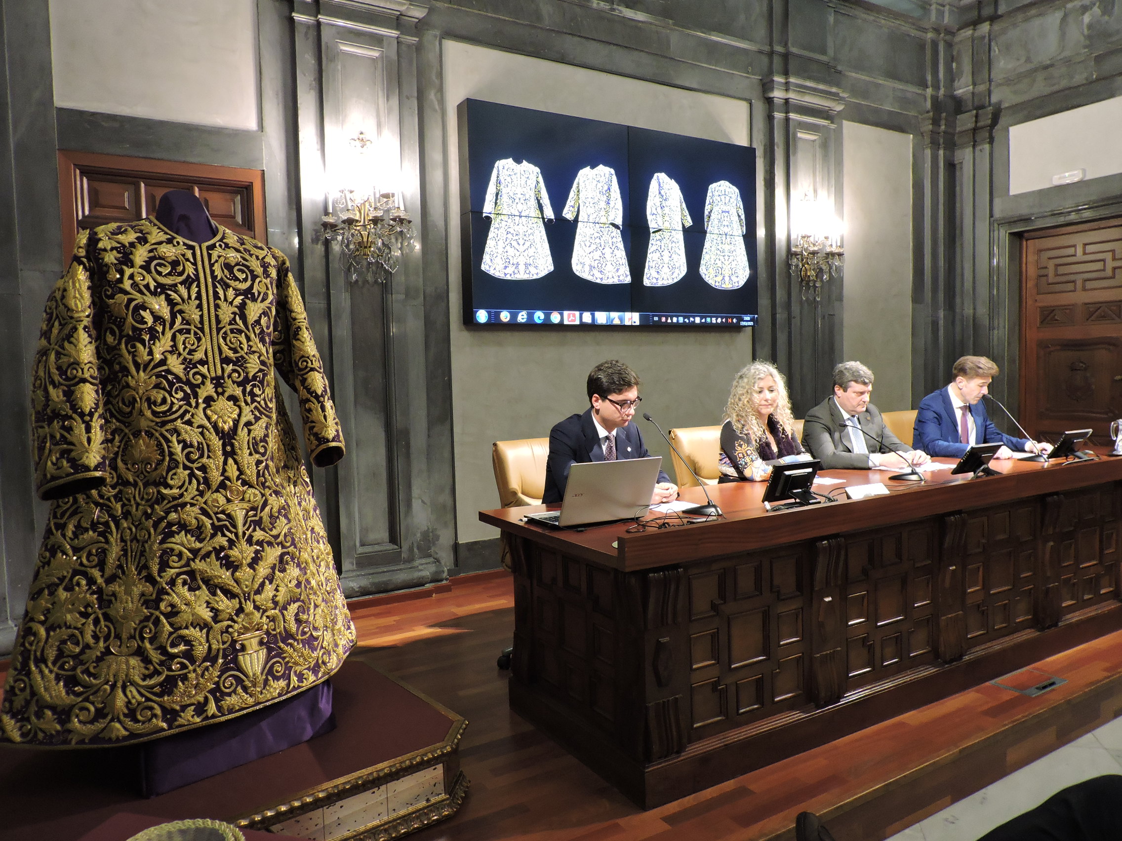 Asimismo, la entidad destaca “la profusa ornamentación de toda la obra”, en la que el bordado ocupa tanto la parte trasera, como la delantera y ambas mangas. El bordado de todo el conjunto se ha realizado en oro fino sobre terciopelo morado “empleando técnicas seguidas de generación en generación y mezclando todo tipo de puntos e hilos”.