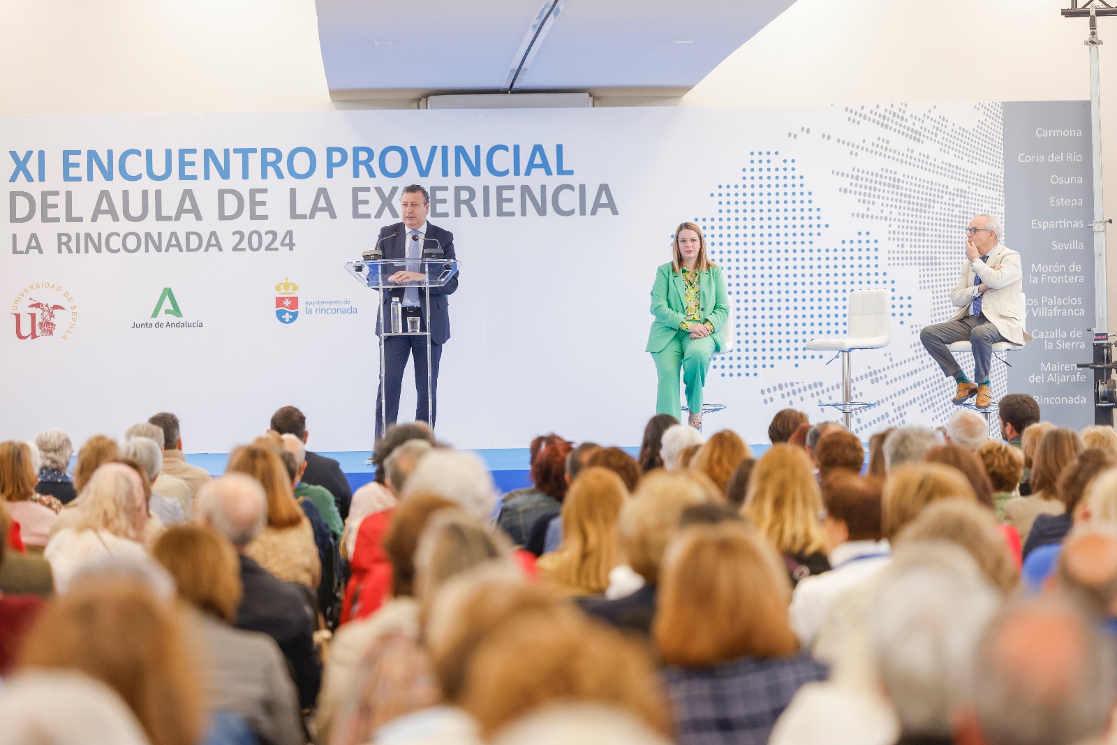 En el acto han participado Noelia Ramírez, delegada de Igualdad, Diversidad y Mayores del Ayuntamiento de La Rinconada, que ha dado la bienvenida a los presentes y ha expresado que ‘desde La Rinconada se ha organizado la Jornada con mucha ilusión, tras el parón sufrido por la pandemia sanitaria’; y Jesús Domínguez Platas, director del Aula de la Experiencia de la Universidad de Sevilla, que ha agradecido la participación de todos los asistentes y la labor desarrollada por todo el equipo de trabajo que ha facilitado la realización de este encuentro provincial.