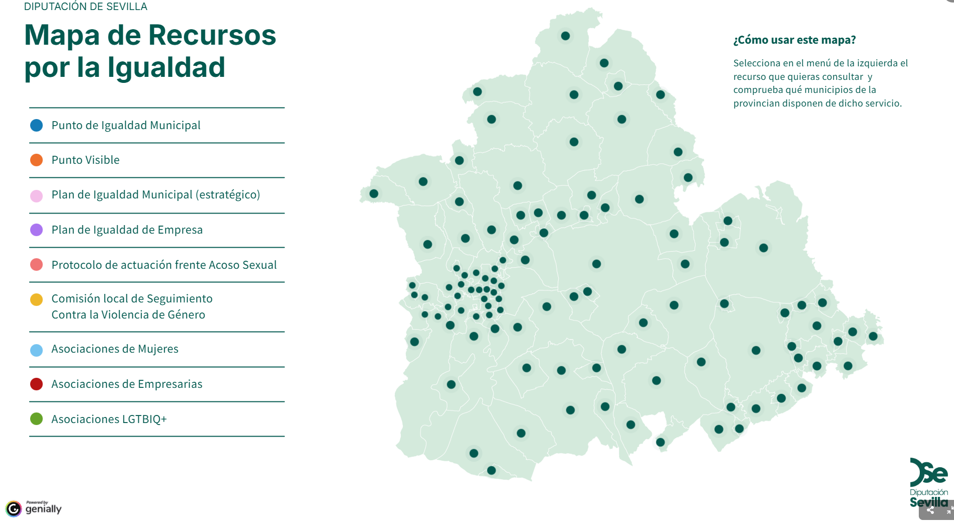 Además, identifica los municipios que cuentan con Planes Estratégicos de Igualdad, Planes de Igualdad de Empresa, Protocolos frente al acoso sexual, o que forman parte de Comisiones Locales de Seguimiento contra la Violencia de Género. También recopila el tejido asociativo relacionado con la igualdad y la diversidad de cada localidad, incluyendo asociaciones de mujeres, colectivos LGTBI y asociaciones de empresarias.