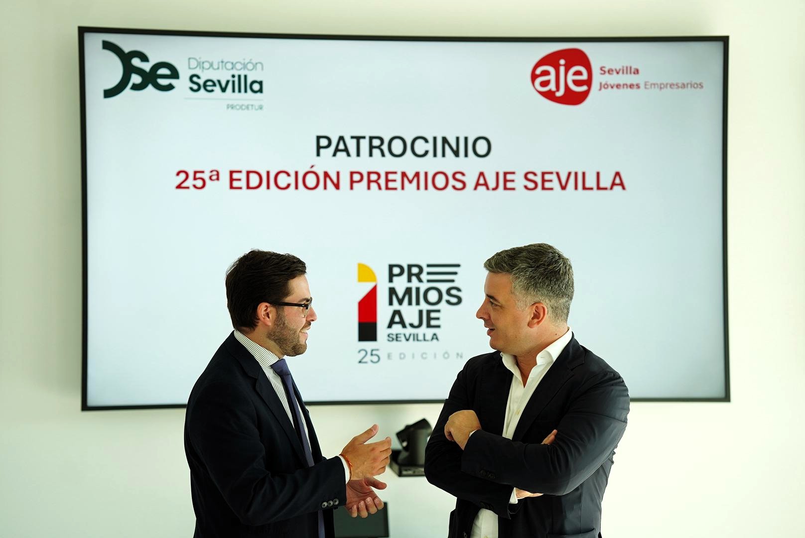 El vicepresidente de Prodetur, Rodrigo Rodríguez Hans, ha mantenido un encuentro con el presidente de la Asociación de Jóvenes Empresarios/as de Sevilla (AJE-Sevilla), Miguel Ángel Pérez, con motivo del patrocinio, por parte de la sociedad provincial, y como único patrocinador institucional del sector público, este año, de los Premios de esta entidad que aglutina a la joven empresa del territorio. Una edición muy especial la de este 2025, dado que estos galardones celebrarán su 25 aniversario en un acto público previsto para el próximo 11 de septiembre.