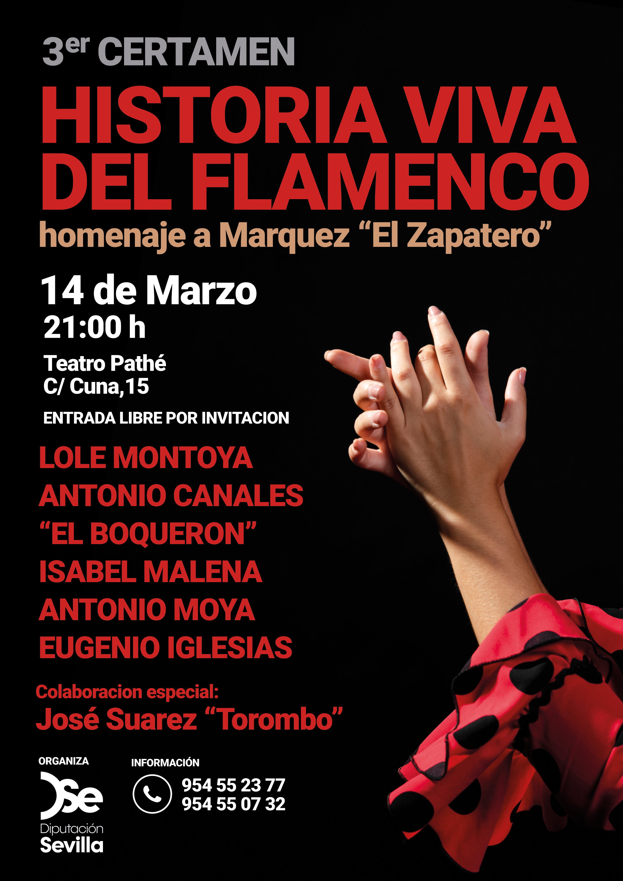 El tercer certamen ‘Historia viva del Flamenco’ se va a celebrar el viernes 14 de marzo, a las 21 horas, en el Teatro Pathé de Sevilla (C/Cuna, 15) y las personas aficionadas e interesadas en asistir tendrán entrada libre por invitación. Para información sobre las invitaciones, la consulta se puede hacer en los teléfonos: 954 55 23 77 y 954 55 07 32