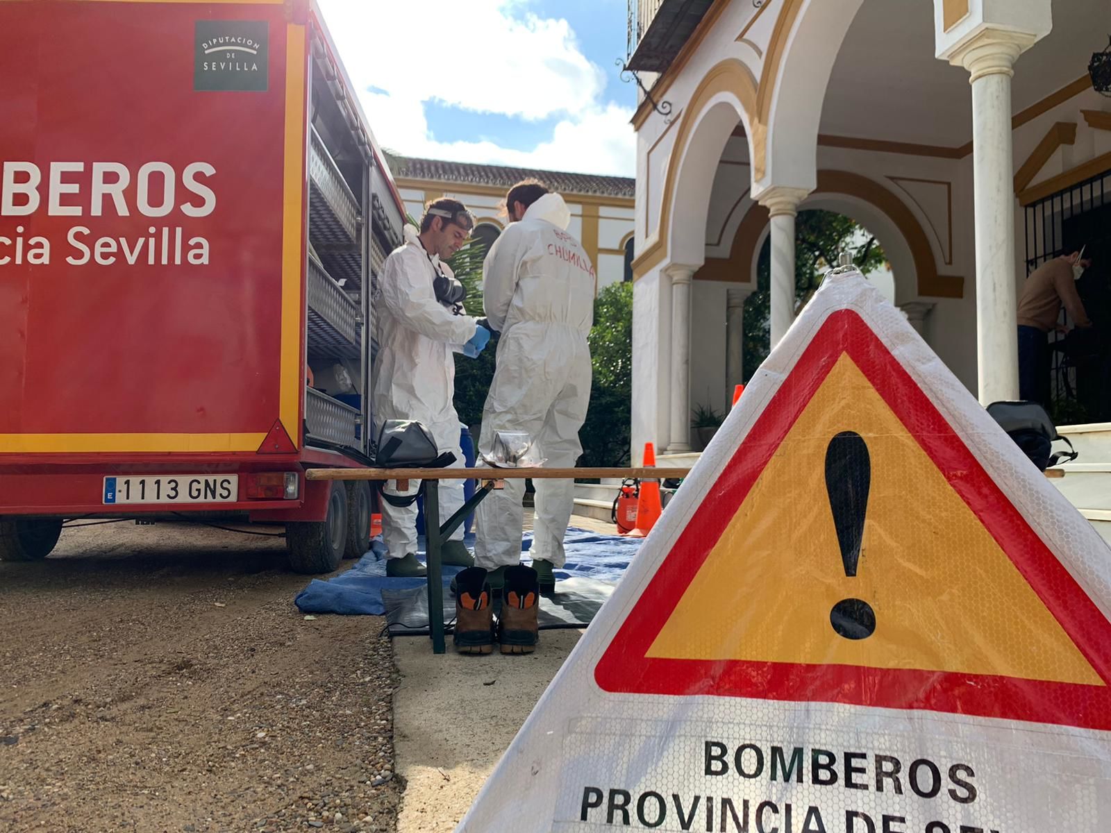 Bomberos de los parques de Sanlúcar la Mayor y de Cantillana centran hoy sus actuaciones de desinfección en residencias de dichas localidades, con un mantenimiento que se viene realizando semanalmente y, en algunas ocasiones como ocurre hoy, lo realizan durante varios días seguidos según si los centros residenciales son de mayores dimensiones.