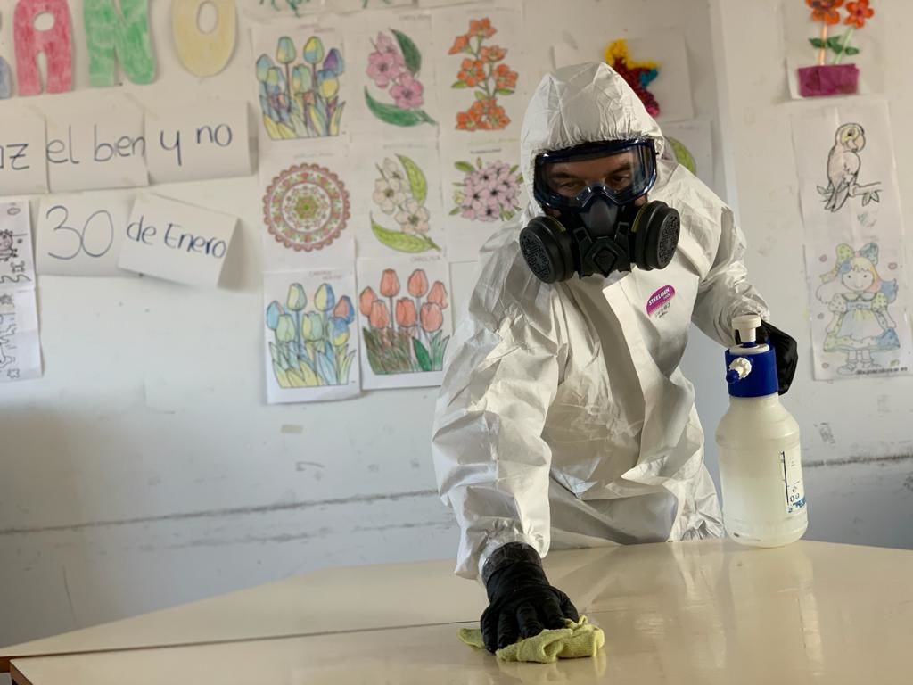 Antes de comenzar con los trabajos de desinfección, al llegar al centro residencial los bomberos han establecido una zona limpia donde los efectivos pueden vestirse poniéndose los buzos protectores, las botas, que quedan selladas con el buzo y así se impide la contaminación, se colocan dobles guantes y máscaras, esencialmente. Cuando el bombero ya está preparado para entrar en el lugar a descontaminar es observado previamente por otro compañero para asegurarse que va perfectamente protegido y el equipo cumple con todos los requisitos de seguridad.