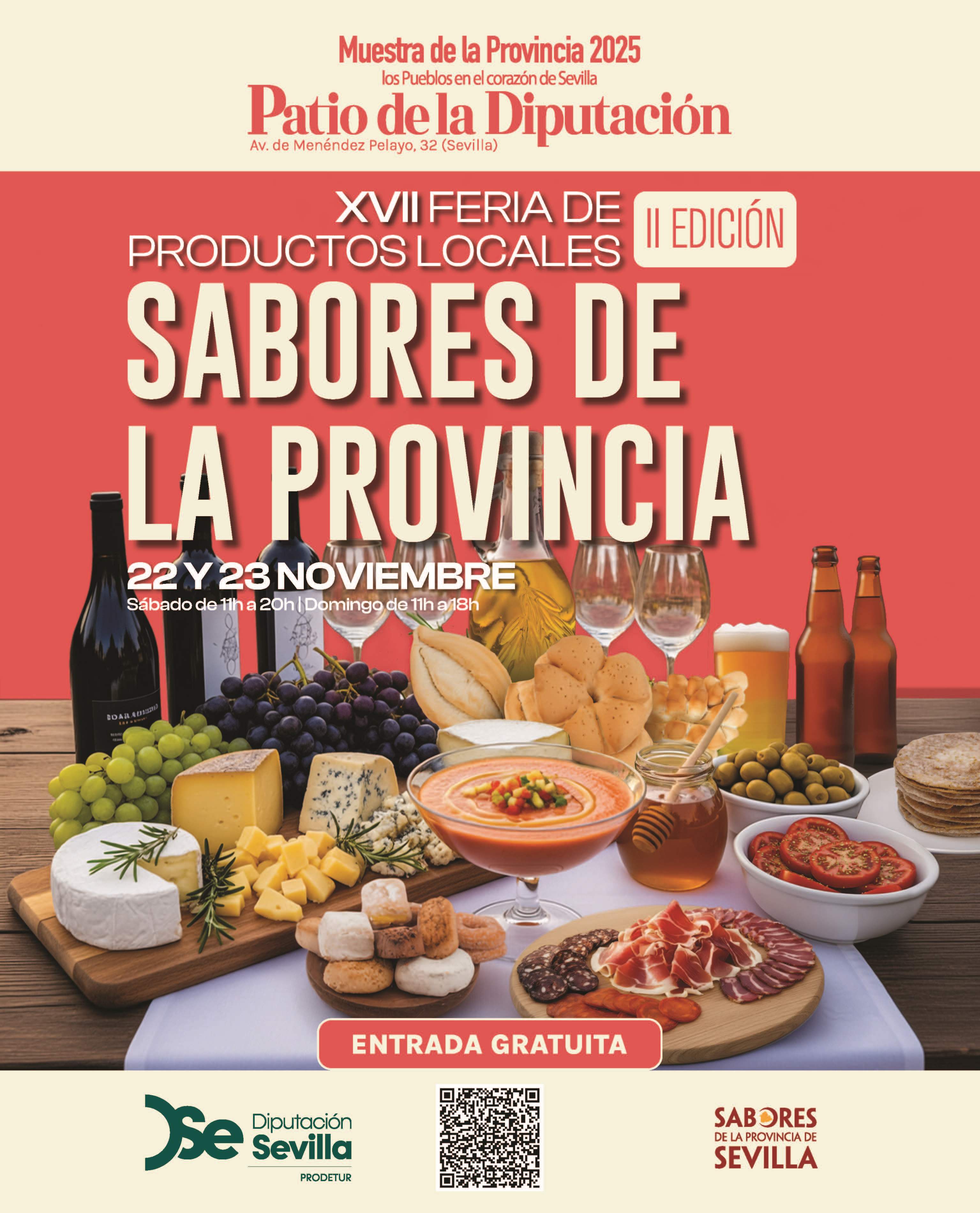 El patio de la Diputación de Sevilla acoge este sábado, 22 de noviembre, y el domingo, 23, a partir de las 11.00 horas, una nueva edición de la XVII Feria de Productos Locales ‘Sabores de la Provincia de Sevilla’. Organizada por Prodetur, esta feria constituye la sexta cita del calendario de la Muestra de la Provincia 2025 -que contempla un total de nueve eventos hasta diciembre- y la cuarta de las siete dedicadas específicamente a los productos agroalimentarios bajo la marca ‘Sabores de la Provincia de Sevilla’.