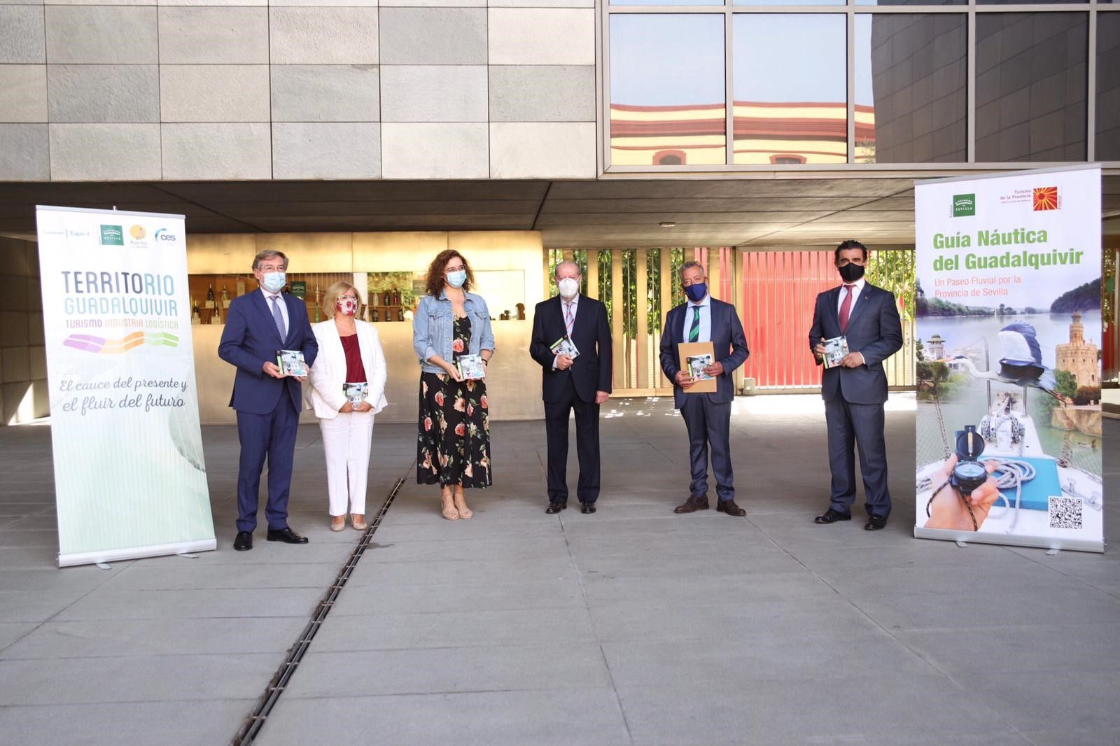 El presidente de la Diputación, Fernando Rodríguez Villalobos, ha presentado la publicación ‘Un Paseo Fluvial por la Provincia de Sevilla. Guía Náutica del Guadalquivir’, editada por Prodetur, en formato libro de viaje. A la presentación, en la que Villalobos ha estado acompañado por el presidente de la Autoridad Portuaria de Sevilla, Rafael Carmona, la vicepresidenta de Prodetur, Manuela Cabello, la alcaldesa de Gelves, Isabel Herrera, y el autor de la guía, Francisco José Rodríguez, han asistido representantes del sector náutico de la provincia.