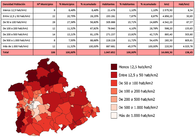 La densidad de población es superior a la de España y del resto de Andalucía, teniendo mucho que ver en ellos los diferentes tamaños de los municipios. La provincia de Sevilla cuenta con más del 62% de los municipios por debajo de la densidad media de la provincia, existiendo grandes oscilaciones entre los municipios del área metropolitana y del resto de la provincia.