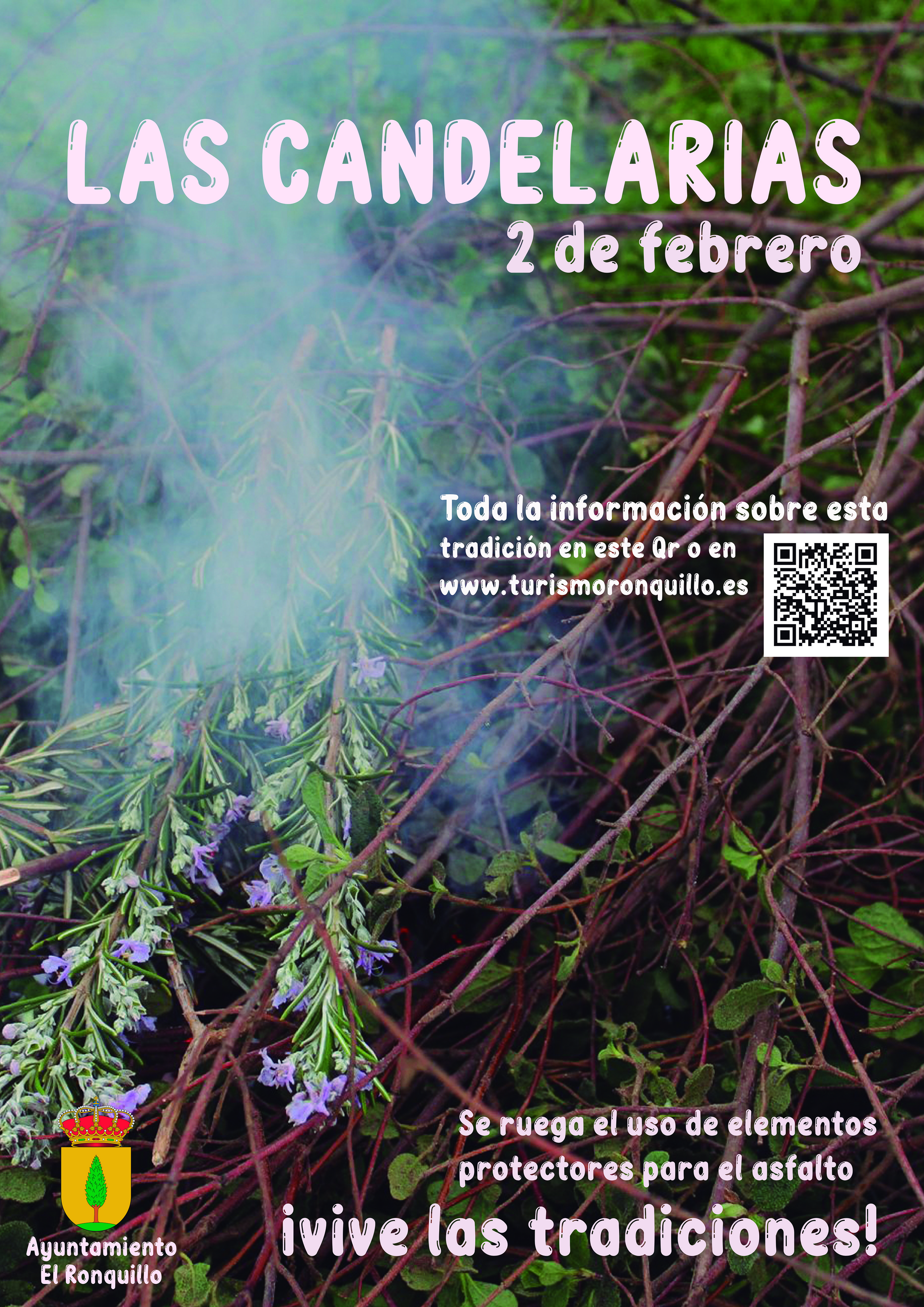 El 2 de febrero es tradición en El Ronquillo celebrar La Candelaria prendiendo candelas de monte y romero en las calles del pueblo, una antigua tradición local que se mantiene muy arraigada, y que en los últimos años se viene celebrando el sábado más cercano a esta fecha, por lo que la mayoría de las candelas serán prendidas el próximo sábado 4 de febrero.Mayores y niños salen al campo durante los días previos a esta fecha, para recoger monte. Al oscurecer, se amontona el monte recogido y se prende en su base para saltar encima o cantar y bailar alrededor de él. También se hacen hogueras de leña para asar la carne.Muchas de las candelas se mantienen prendidas hasta el amanecer.¡Vive las tradiciones! ¡Celebra Las Candelarias!.Se ruega que se utilice protección para el asfalto.