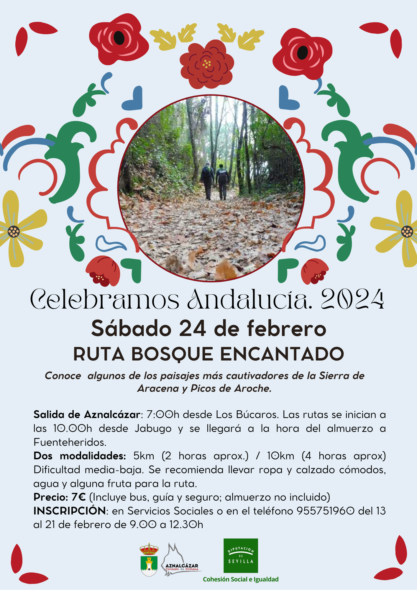 CELEBRAMOS ANDALUCÍA. RUTA BOSQUE ENCANTADOOtra de las actividades programadas en torno al Día de Andalucía es la Ruta del Bosque Encantado. Una oportunidad de conocer algunos de los paisajes más cautivadores de la Sierra de Aracena y Picos de Aroche realizando una ruta por sus senderos.Sábado 24 de febreroSalida a las 7:00h desde Los Búcaros. Las rutas se inician a las 10.00h desde Jabugo y se llegará a la hora del almuerzo a Fuenteheridos.Dos modalidades: 5km (2 horas aprox.) / 10km (4 horas aprox) Dificultad media-baja. Se recomienda llevar ropa y calzado cómodos, agua y alguna fruta para la ruta.Precio: 7€ (Incluye bus, guía y seguro; almuerzo no incluido)INSCRIPCIÓN: en Servicios Sociales o en el teléfono 955751960 del 13 al 21 de febrero de 9.00 a 12.30h