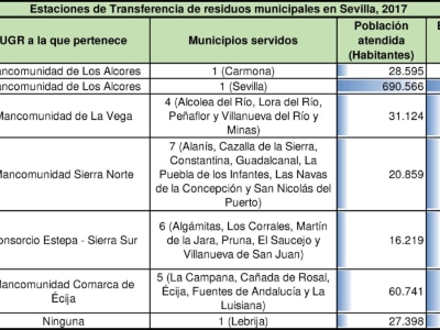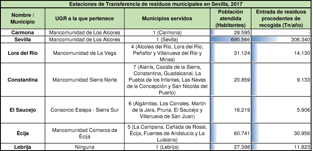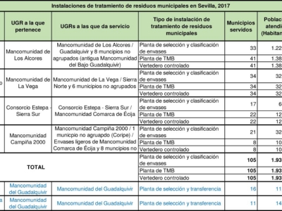 En la provincia de Sevilla hay 4 plantas de tratamiento de residuos municipales, las cuales cuentan todas con planta de selección y clasificación de envases, planta de tratamiento mecánico biológico, TMB, y vertedero controlado asociado. También cuenta con dos centros de selección y transferencia, en Espartinas y Bollullos de la Mitación, pertencientes a la Mancomunidad del Guadalquivir y siete estaciones de transferencia.
