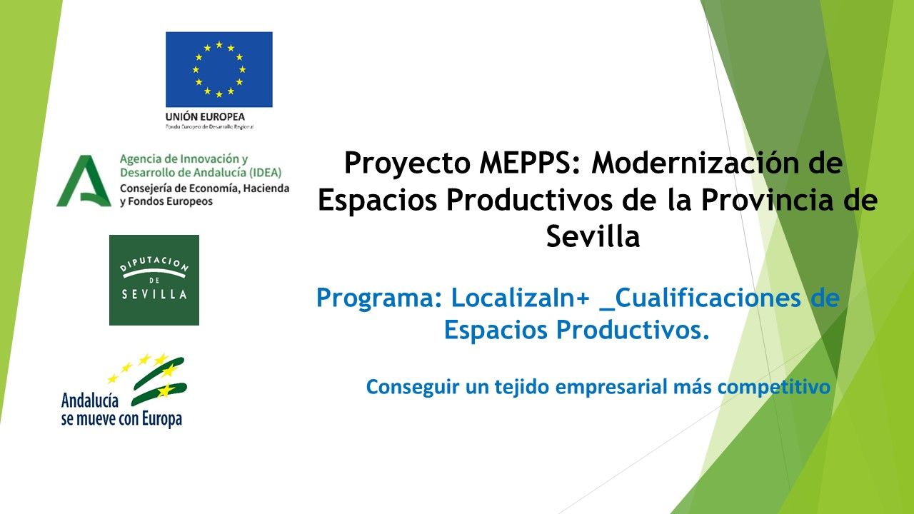Descargar pdf Proyecto: "MEPPS-MODERNIZACIÓN DE ESPACIOS PRODUCTIVOS EN SEVILLA" Actuaciones conjuntas de dotación y modernización de espacios productivos y de innovación. LocalizaIn+_Cualificaciones de Espacios. Fondos FEDER. Descargar pdf Información en el portal de Prodetur MP, S.A.U. Información en formato PDF 247.25 kb Formato: PDF